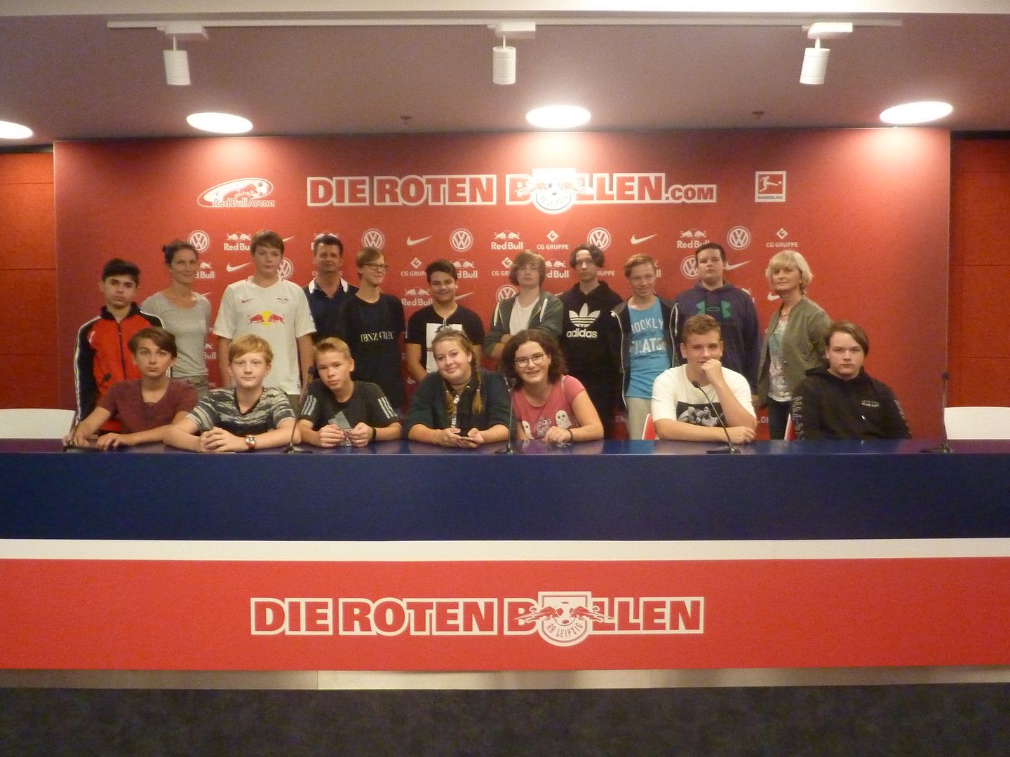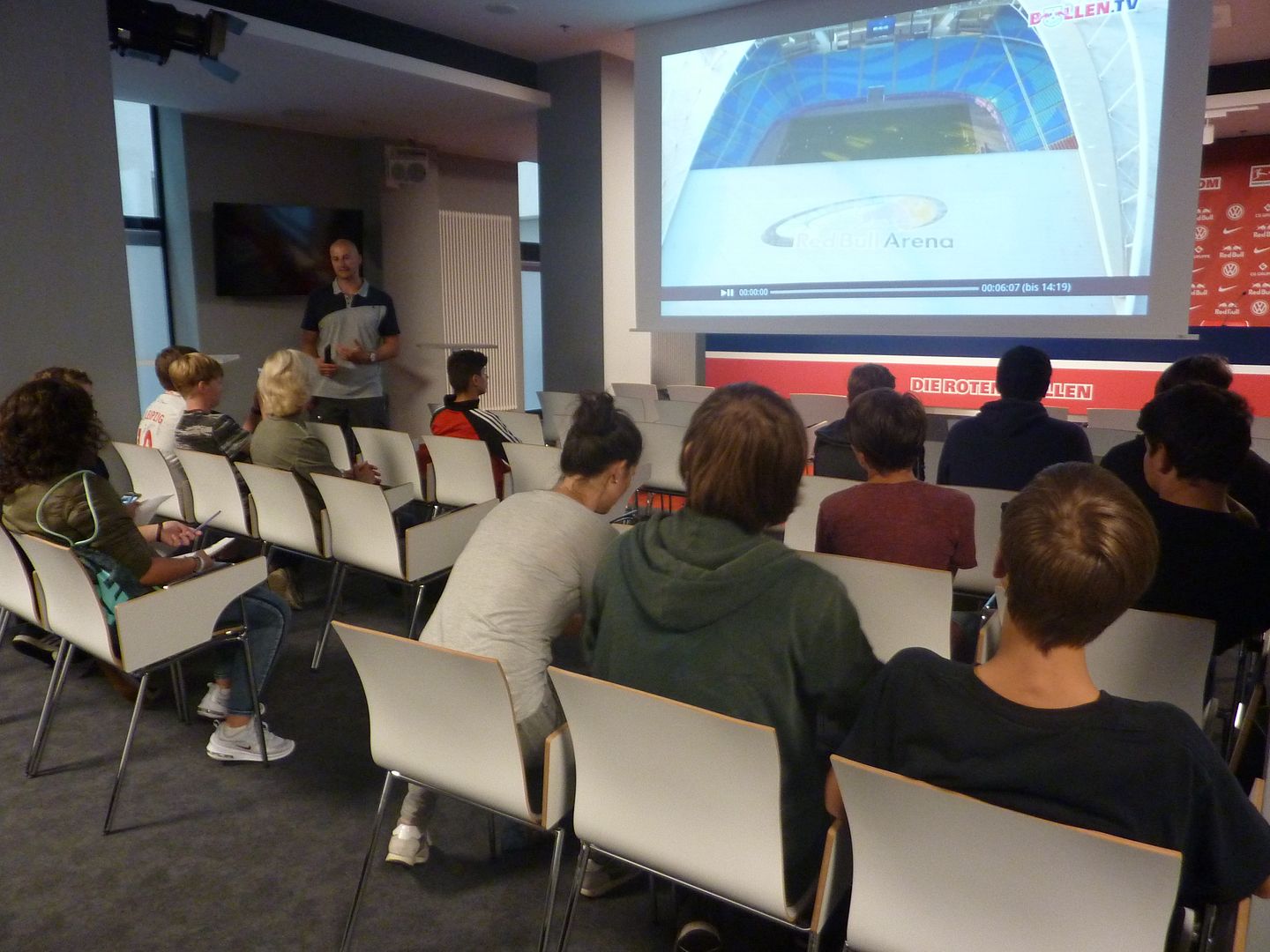 Am 7. September haben Schüler der Klasse 8a eine Exkursion in die REDBULL-ARENA nach Leipzig durchgeführt. Dem war der Workshop „Hier läuft´s rund“ im Lindenau-Museum zur Ausstellung „Das Runde und das Eckige. Fußball in der Kunst“ vorausgegangen. Es entstand ein Tischfußballspiel für die Klasse. Damit die Aktion rund wird, gehörte natürlich ein Besuch der REDBULL-ARENA dazu. Frau Glück vom Lindenau-Museum organisierte den Workshop und die Exkursion im Rahmen des Kooperationsprojektes Lindenaus Kunstexperten – die Zweite. Die Schüler konnten den gesamten Innenbereich sehen und in der Mixed-Zone auf die Torwand schießen. In der RB-Kabine und auf der Ersatzbank am Spielfeldrand wurden schöne Fotos gemacht. Auch der VIP- und der Pressebereich waren sehr interessant. Vielen Dank an Frau Glück für diese sehr schöne Exkursion!