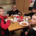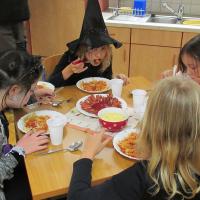 Der Mittwoch wurde von der ganzen Klasse sehnsüchtig erwartet – endlich fand unsere Lesenacht statt. Wir trafen uns 17.00 Uhr erneut in der Schule. Natürlich durften wir uns auch verkleiden. So konnte Frau Stange Vampire, Hexen, Zombies und Skelette begrüßen. Mit dem Grusellied, dem Gedicht und einer kleinen Halloween-Einheit in Englisch haben wir die helfenden Eltern an diesem Abend begrüßt. Danach haben wir Kürbislaternen gebastelt und diese gleich zu unserer Abendwanderung mitgenommen. Frau Stange hat uns auf dem Weg noch eine tolle Gruselgeschichte erzählt. Währenddessen haben Niclas’ Eltern den Gruselschmaus zubereitet – Nudeln mit Tomatenblutsoße und Monsterwürstchen. Das war lecker! Gemeinsam haben wir im Anschluss unser Schlaflager im Klassenzimmer aufgebaut. Nachdem alle bettfertig waren, konnte die Lesenacht so richtig beginnen. Jeder, bis auf zwei kleine Schlafmützen, die schon vorher einschliefen, hat etwas vorgelesen. Gruselgeschichten, zum Teil selbst geschriebene, aber auch Gedichte waren dabei. Nach dieser spannenden Gruselnacht schliefen die meisten schnell ein.
